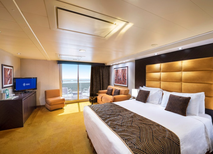Suite s balkónom/panoramatickým oknom: 21-47m², (Royal 53m², Family 52m²)kajuta s manželskou posteľou (na požiadanie 2 oddelené postele) a rozkladacia pohovka. Klimatizácia, kúpeľňa s vaňou, toaletný stolík, priestorná skriňa, interaktívna TV, telefón, minibar, sejf, sušič na vlasy. Balkón so stolíkom a stoličkami/panoramatické okno. Internetové pripojenie (za poplatok).