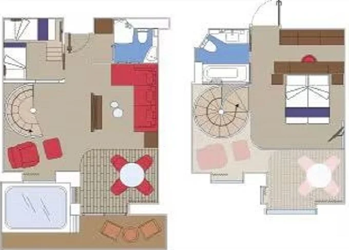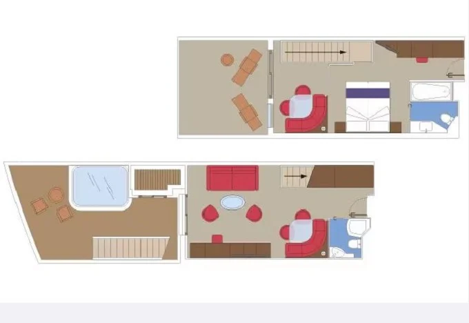 | YJD - Yacht Club Duplex Suite s vírivkou 46 m² + balkón 30 m². Vírivka. 2 podlažia, šatník, 2 kúpeľne (1 s vaňou). Max 4 osoby. 16. paluba. Cenový model MSC Yacht Club. | 8 242 € 4 121 € za osobu |