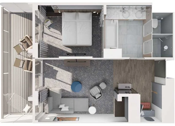 JKBO - Junior Suite s balkónom B 26 m² + balkón 7 m² so stoličkami a podnožkami. 8-12. paluba. Max 4 osoby. Výhody Junior Suite. 10 878 € 5 439 € za osobu