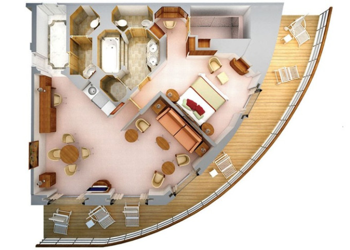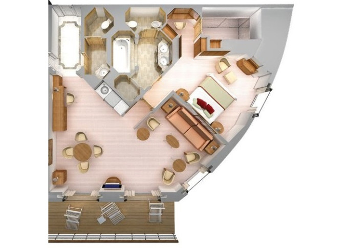 | R1 - Royal Suite 1 92 m² (vrátane balkóna 12 m²), Spálňa s obývacou a jedálenskou časťou. 7. paluba vpredu. Max 3 osoby. | 34 800 € 11 600 € za osobu | ||
